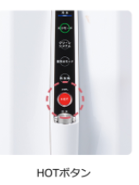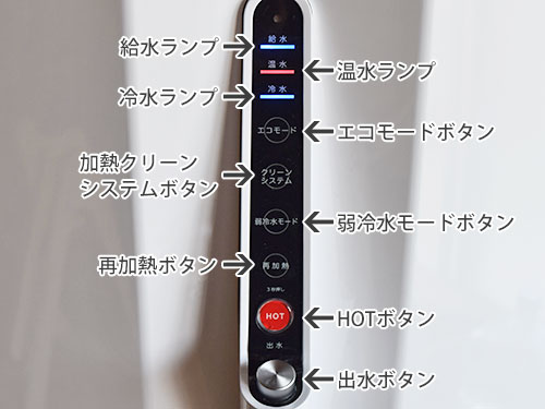 また、お水をお湯に切り替えるHOTボタンは、3秒長押しが必要です。